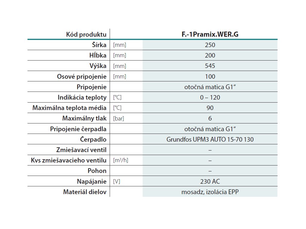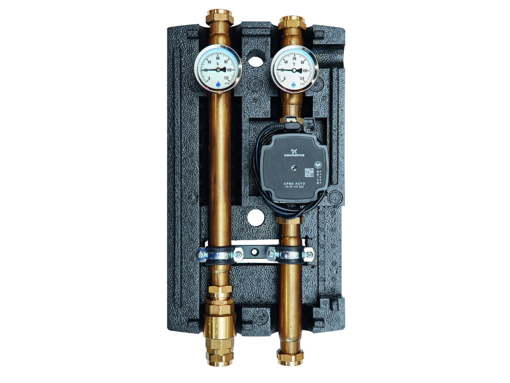 Čerpadlová skupina je navrhnutá pre vykurovacie a chladiace systémy na pripojenie jednotlivých vykurovacích alebo chladiacich okruhov, kde je vstupná teplota vody do okruhu rovnaká ako výstupná teplota vody zo zdroja tepla. Môže byť tiež použitá na pripojenie zásobníka teplej pitnej vody alebo akumulačného zásobníka.\nDo čerpadlovej skupiny bez obehového čerpadla je možné nainštalovať obehové čerpadlo od rôznych výrobcov so stavebnou dĺžkou 130 mm, pričom pripojenie čerpadla je zabezpečené pomocou prevlečnej matice s vnútorným závitom 1″.\nV čerpadlovej skupine s obehovým čerpadlom je inštalované čerpadlo s elektronicky regulovanými otáčkami Grundfos UPM 3 15/70.\nVyhotovenie: Kompaktná, predmontovaná jednotka vložená do tvarovaného tepelnoizolačného obalu z EPP.\nObsahuje: 1x Čerpadlo, 2x guľový kohút, 2x teplomer, 1x spätnú klapku.Dodatočné parametre