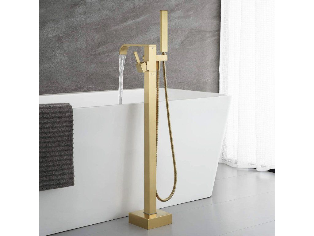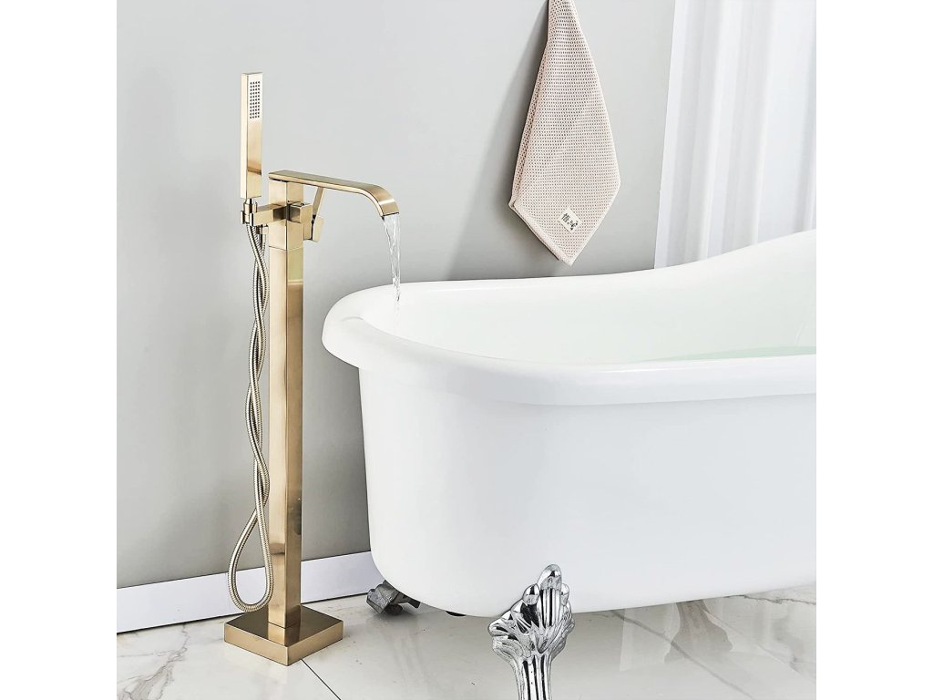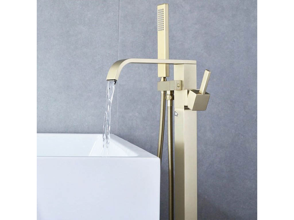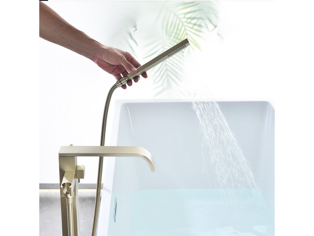 Moderná a veľmi dizajnová voľne stojaca vaňová batéria zaujme svojim neobvyklým dizajnom. Skvele vyplní priestor kúpeľne. Výrobok je vyrobený z vysoko kvalitnej mosadze v zlatom prevedení. Batéria je veľmi odolná a ľahko sa čistí. Voľne stojace vaňové batérie sú moderným a elegantným variantom umiestnenia vodovodných batérií do každej kúpeľne. Je zaujímavou alternatívou k batériám, určeným na stenu či vaňu. Skvele sa hodí do väčších kúpeľní, kde plní nielen čisto funkčnú, ale aj dekoratívnu rolu. V kombinácii s krásnou vaňou spoločne krásne ladia a vytvárajú dokonalý vizuálny efekt. Keramické hlavice zaručujú dlhú životnosť, sprchová hlavica je vybavená systémom Anti-Calc na zamedzenie usadzovania vodného kameňa. Montážny návodDodatočné parametre