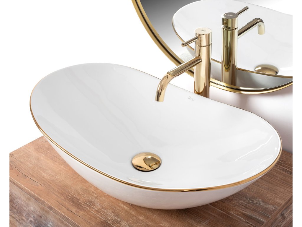Predstavujeme Vám nové moderné umývadlo na dosku série Rea Royal. Umývadlo netradičného tvaru je vyrobené z materiálov najvyššej kvality a jeho vlastnosti splnia všetky vaše požiadavky. Tento model je vhodný predovšetkým pre zákazníka, hľadajúceho funkčné, ale hlavne jednoduché riešenie. Umývadlo je určené na montáž na dosku, ale je možné ho namontovať aj na skrinku. Umývadlo v bielom lesklom prevedení so zlatým okrajom sa navyše vďaka špeciálnej fáze výroby ľahko čistí a je veľmi odolné.Dodatočné parametre
