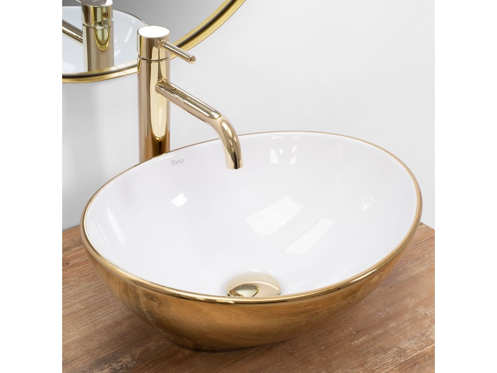 Umývadlo Rea Sofia zlatobiele spája módu s tradíciou ušľachtilých farieb a dizajnu. Luxusný model sa bude hodiť do každého interiéru. Trblietavá keramika, biela vo vnútri a zlatá zvonku, upúta pozornosť každého hosťa a ohromí ho. Umývadlo Rea Sofia zlatobiele vyzerá skvele v kombinácii so zlatými doplnkami; click-clack výpusťou alebo batérie Rea Tess zlatým, ale aj s čiernym alebo chrómovým prevedením.Dodatočné parametre