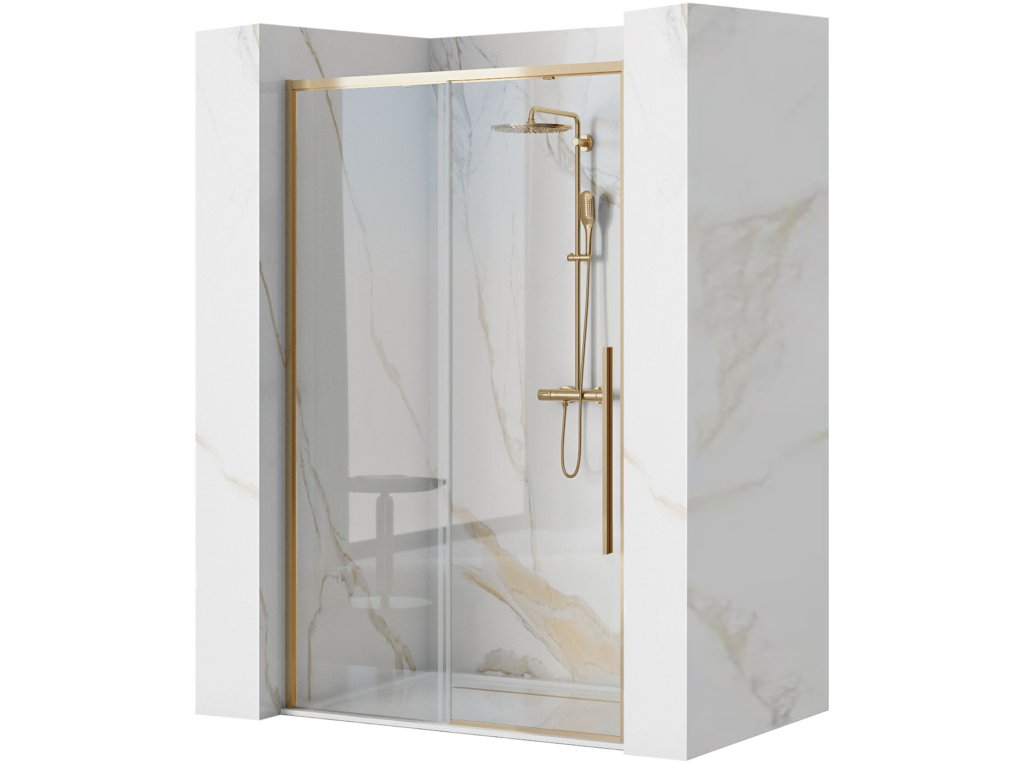 Rea Solar sú výrazné, ale nadčasové a moderné sprchové dvere vyrobené z najkvalitnejších materiálov a povrchovo upravené zlatým laminátom. Lesklý zlatý povlak je odolný voči nečistotám a škvrnám a taktiež sa ľahko čistí. Kombinácia zlatých profilov, dlhej rukoväte a pántov s priehľadnou líniou sklenených plôch skvele zapadne do modernej aj tradičnej kúpeľne.Dodatočné parametre