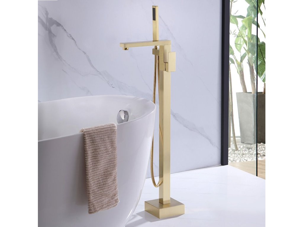 Moderná a veľmi dizajnová voľne stojaca vaňová batéria zaujme svojim neobvyklým dizajnom. Skvele vyplní priestor kúpeľne. Výrobok je vyrobený z vysoko kvalitnej mosadze v zlatom prevedení. Batéria je veľmi odolná a ľahko sa čistí. Voľne stojace vaňové batérie sú moderným a elegantným variantom umiestnenia vodovodných batérií do každej kúpeľne. Je zaujímavou alternatívou k batériám, určeným na stene či vane. Skvele sa hodí do väčších kúpeľní, kde plní nielen čisto funkčnú, ale aj dekoratívnu rolu. V kombinácii s krásnou vaňou spoločne krásne ladia a vytvárajú dokonalý vizuálny efekt. Keramické hlavice zaručujú dlhú životnosť, sprchová hlavica je vybavená systémom Anti-Calc na zamedzenie usadzovania vodného kameňa. Montážny návodDodatočné parametre