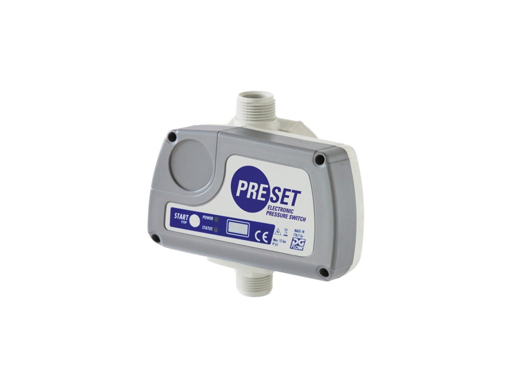 Pre ovládanie čerpadiel pomocou zariadenia PRESET, je nutné do systému inštalovať aj tlakový zásobník s dodstatočným objemom, aby sa zamedzilo opakovanému zapínaniu a vypínaniu čerpadla, počas prevádky. \n \nPRESET je vybavený presným tlakovým senzorom a ponúka: \n- voliteľný štart/stop tlak od 0,8 do 9,0 baru v krokoch po 0,2 baru \n- nastavenie parametrov je presné a spoľahlivé \n- digitálny podsvietený displej \n- vstavaný spätný ventil \n- živicou chránený plošný spoj \n- ochrana proti: \n-chodu na sucho \n-nadprúdová ochrana \n-nadmerne častým spínaním \n- voliteľný spínací čas \n- voliteľný resetovací čas \n- nízka tlaková strata \n \nTechnické údaje: \nnapätie: 230 V AC \nfrekvencia: 50 Hz \nmaximálny prúd: 16 A \nIP krytie: IP 65 \npracovná teplota: 0-65 oC \nmax. prietok: 200 l/min \npripojenie: 1“ \npracovný/poruchový tlak: 10bar / 40 barDodatočné parametre