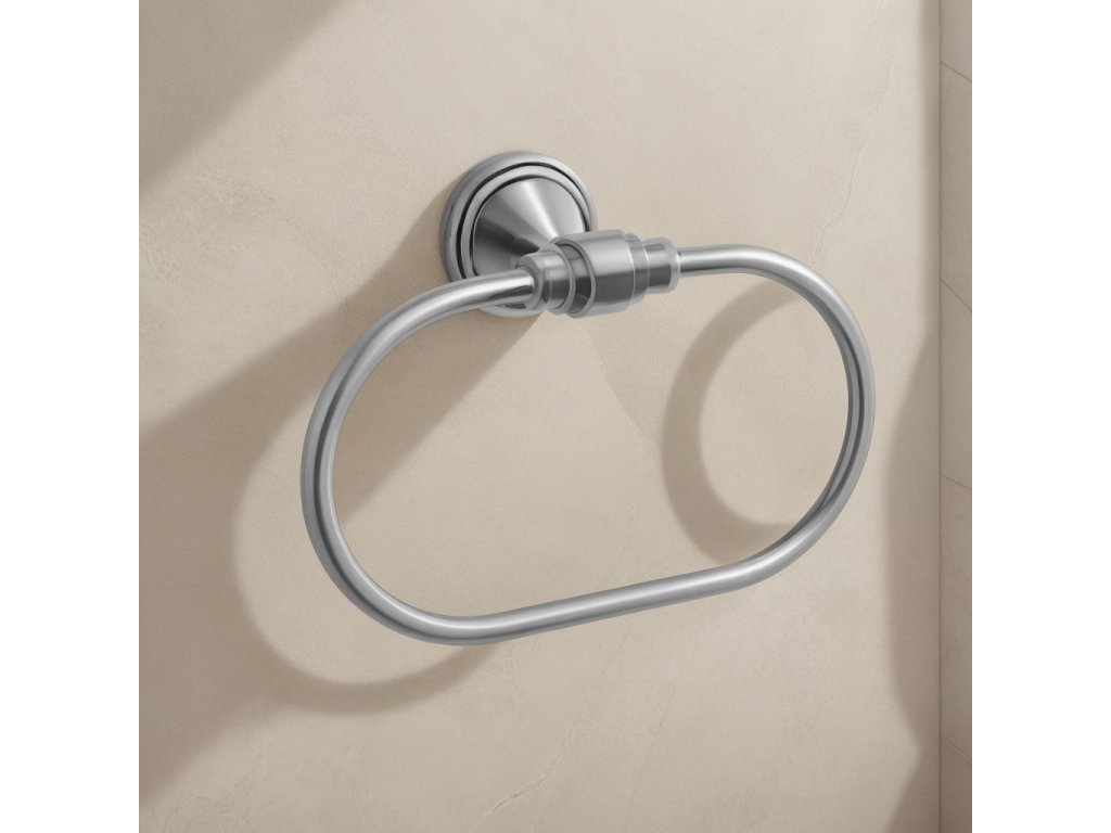Štýlový vešiak na uteráky v tvare prstena je praktickým a elegantným doplnkom do každej kúpeľne. Je vyrobený z vysoko kvalitnej ocele s brúseným povrchom, odolný voči vlhkosti, korózii a každodennému používaniu. Kruhový dizajn zaisťuje pohodlné zavesenie uterákov a drážkovaný detail na upevnení mu dodáva moderný vzhľad. Nástenný vešiak šetrí miesto a udržiava umývadlo alebo kúpeľňu v poriadku. Toto riešenie spája funkčnosť s estetikou, zdôrazňuje dizajn interiéru a ladí s ostatnými kúpeľňovými doplnkami z leštenej ocele.