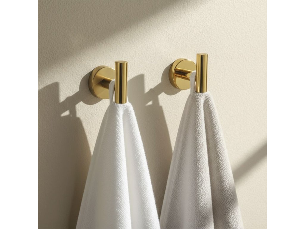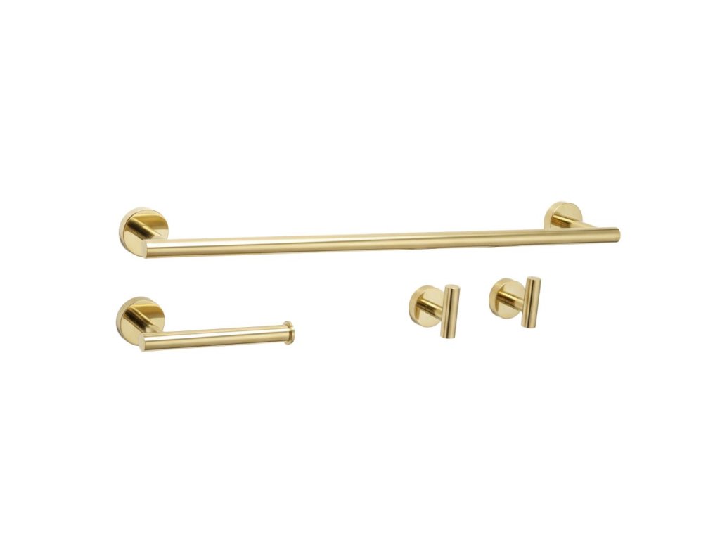 Súprava kúpeľňových doplnkov Ari je elegantné a funkčné riešenie, ktoré prinesie do kúpeľne moderný štýl a nádych luxusu. Súprava obsahuje držiak na uterák, držiak na toaletný papier a dva praktické háčiky – čím vytvára kompaktný a estetický celok ideálny na každodenné používanie. Všetky prvky sú vyrobené z vysoko kvalitného kovu, odolného voči vlhkosti a korózii. Povrch v zlatej farbe s vysokým leskom dodáva eleganciu a prestíž, pričom si zachováva trvácnosť a odolnosť voči stopám používania. Doplnky sa montujú na stenu, čo zaručuje stabilitu, pevnosť a pohodlie pri každodennom používaní. Súprava Ari spája jednoduchosť formy s nadčasovou estetikou. Minimalistický dizajn sa dokonale hodí do klasických aj moderných kúpeľní, vytvárajúc súdržný, elegantný a funkčný priestor.