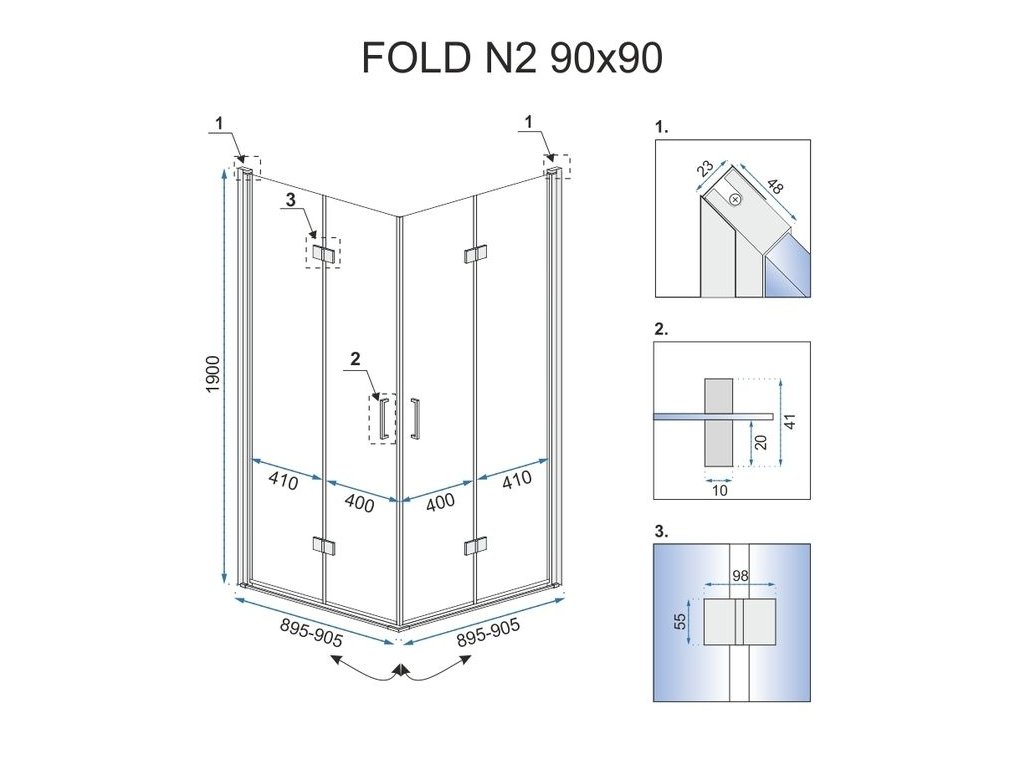 Skladací sprchovací kút, pozostáva z dvoch skladacích sklenených dverí s elegantnými chrómovými prvkami. Tento model je perfektným riešením pre malé a nenápadné kúpeľne. Každé z krídiel je možné zložiť k stene, a to ako dovnútra, tak von, čo dáva neobmedzené možnosti v praktickom využití kúpeľne. Sklo v kabíne Fold je nielen bezpečné, ale aj praktické vďaka povrchovej úprave Easy Clean. Vďaka tejto modernej technológii sa na skle neusadzuje vodný kameň, čistenie nevyžaduje použitie silných prostriedkov. Sklápacia rohová sprcha Rea Fold N2 je vybavená hliníkovými profilmi s hrúbkou 23 mm. Praktické, mosadzné madlá umiestnené v optimálnej výške pre užívateľov umožňujú pohodlné otváranie a zatváranie dverí. Na výrobu modelu bolo použité bezpečnostné tvrdené sklo hrúbky 6 mm. V závislosti na individuálnych preferenciách a potrebách je možné kabínu namontovať na vaničku alebo bezprostredne na podlahu. Na model sa vzťahuje dvojročná záruka. Montážny návodDodatočné parametre