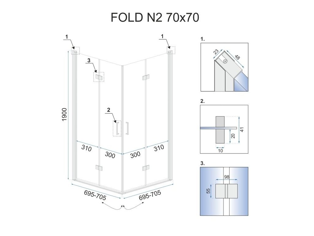 Skladací sprchovací kút, pozostáva z dvoch skladacích sklenených dverí s elegantnými chrómovými prvkami. Tento model je perfektným riešením pre malé a nenápadné kúpeľne. Každé z krídiel je možné zložiť k stene, a to ako dovnútra, tak von, čo dáva neobmedzené možnosti v praktickom využití kúpeľne. Sklo v kabíne Fold je nielen bezpečné, ale aj praktické vďaka povrchovej úprave Easy Clean. Vďaka tejto modernej technológii sa na skle neusadzuje vodný kameň, čistenie nevyžaduje použitie silných prostriedkov. Sklápacia rohová sprcha Rea Fold N2 je vybavená hliníkovými profilmi s hrúbkou 23 mm. Praktické, mosadzné madlá umiestnené v optimálnej výške pre užívateľov umožňujú pohodlné otváranie a zatváranie dverí. Na výrobu modelu bolo použité bezpečnostné tvrdené sklo hrúbky 6 mm. V závislosti na individuálnych preferenciách a potrebách je možné kabínu namontovať na vaničku alebo bezprostredne na podlahu. Na model sa vzťahuje dvojročná záruka. Montážny návodDodatočné parametre