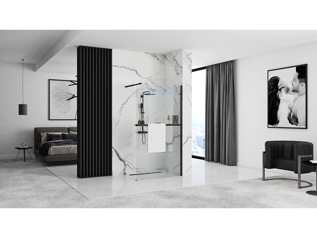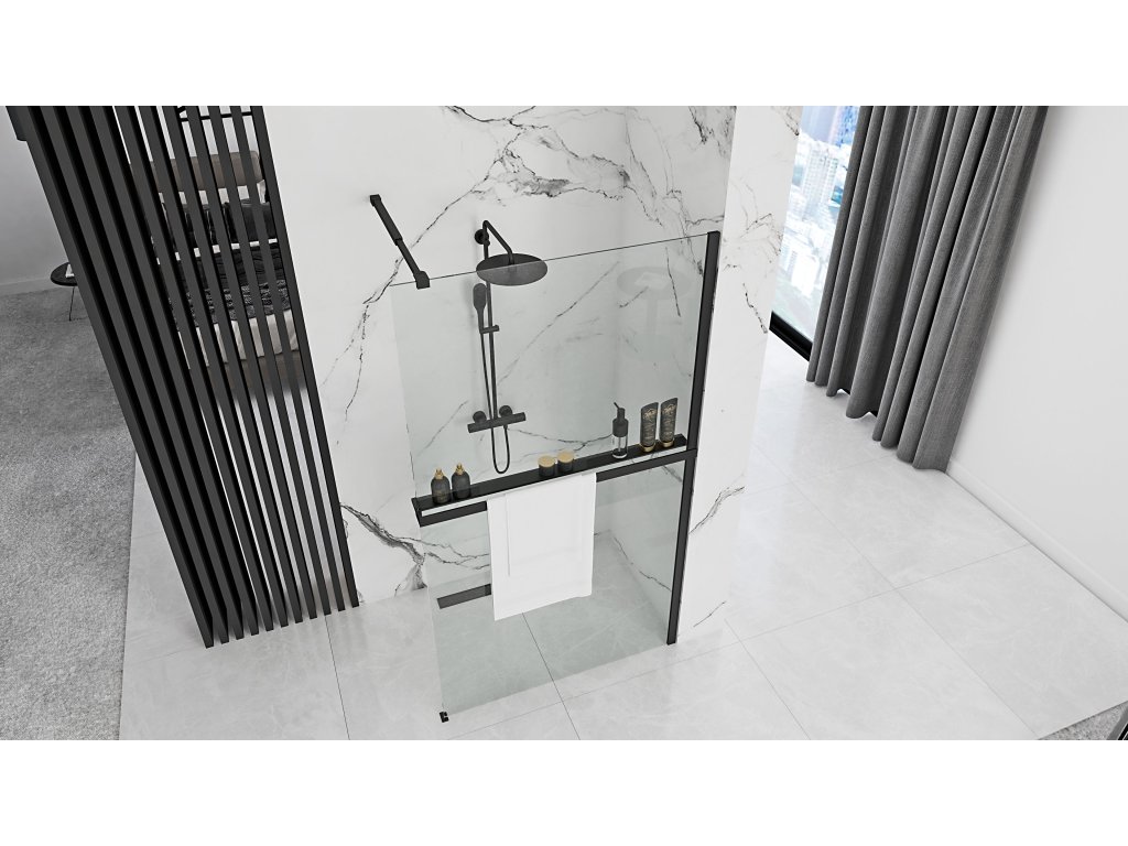 Predstavujeme Vám krásnu, mimoriadne funkčnú a hlavne modernú sprchovú zástenu, ktorá sa dokonale hodí do Vašej kúpeľne, kde vyplní Váš priestor a zároveň zachová dokonalý vzhľad a estetiku Vášho interiéru. Zástena je určená na montážnu buď na sprchovú vaničku, alebo na dlažbu s odtokovým žľabom. Je vyrobená z vysoko kvalitného trhaného skla o hrúbke 8mm.\n\n Čierne časti sprchovej zásteny dostali povrchovú úpravu v prevedení štvornásobného laserovania čierneho smaltu tej najvyššej kvality. Vďaka tejto technológii sú hliníkové časti zásteny chránené proti korózii, odtlačkom prstov a strate farby.\n\n Vďaka špeciálnej fáze výroby je zástena veľmi odolná a ľahko sa čistí. Vhodné sprchové vaničky a odtokové žľaby nájdete v našej ponuke.\n\n Súčasťou tohto setu je polička a vešiak na uteráky.\n\nMontážny návod\n\nCADDodatočné parametre