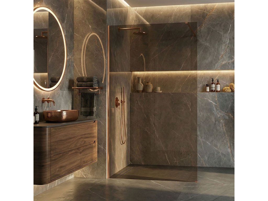 Snívate o kúpeľni plnej tepla a luxusu? Objavte sprchovú stenu walk-in Rea Flexi v jedinečnej konfigurácii: sklo v odtieni zadymenej hnedej a profil vo farbe kartáčovanej medi. Toto spojenie modernej formy a elegantného vyhotovenia dodáva interiéru osobitý charakter. Konštrukcia z bezpečného 8 mm tvrdeného skla zaručuje dlhú životnosť a stabilitu.8 mm tvrdené sklo (zadymená hnedá) – hrubé a bezpečné sklo s hnedým tónom, ktoré prináša do priestoru teplo a zabezpečuje súkromie.Hliníkový profil v kartáčovanej medi – luxusná kartáčovaná povrchová úprava profilu a stabilizačného ramena, dokonale ladiaca s hnedou sklenenou tabuľou.Povrchová úprava Easy Clean – neviditeľná hydrofóbna vrstva uľahčujúca stekanie vody a chrániaca pred usadeninami mydla a vodného kameňa.Stabilizačné rameno 120 cm s možnosťou skrátenia – horné rameno v medenom odtieni je možné prispôsobiť individuálnym požiadavkám.Univerzálna montáž – stenu možno namontovať na pravú alebo ľavú stranu, na vaničku alebo priamo na podlahu.Konštrukcia Walk-In – moderný otvorený vstup bez pohyblivých prvkov, ktorý zaručuje pohodlie a spoľahlivosť.Sprchová stena Rea Flexi je ideálnou voľbou pre tých, ktorí hľadajú vycibrený štýl. Medené detaily v kombinácii s hnedým sklom vytvárajú kúpeľnú zónu s výnimočnou atmosférou. Vďaka povrchovej úprave Easy Clean a kvalitným materiálom spája produkt vysokú estetiku s každodennou funkčnosťou.Dodatočné parametre