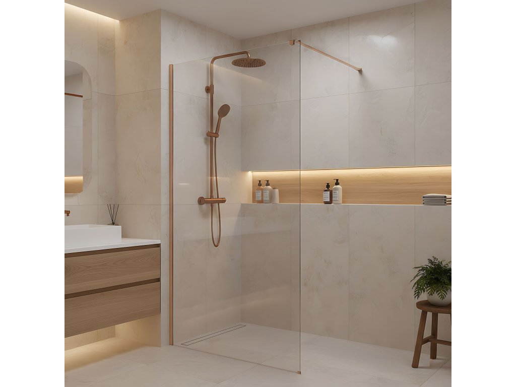 Snívate o kúpeľni plnej tepla a luxusu? Objavte sprchovú stenu walk-in Rea Flexi v zaujímavej konfigurácii: transparentné sklo a profil vo farbe kartáčovanej medi. Toto spojenie modernej formy a elegantného vyhotovenia dodáva interiéru jedinečný charakter. Konštrukcia z bezpečného 8 mm tvrdeného skla zaručuje dlhú životnosť a stabilitu.8 mm tvrdené sklo – hrubé, bezpečné transparentné sklo, ktoré vizuálne nenarúša priestor.Hliníkový profil v kartáčovanej medi – luxusná kartáčovaná povrchová úprava profilu a stabilizačného ramena, dokonale ladiaca s čírym sklom.Povrchová úprava Easy Clean – neviditeľná hydrofóbna vrstva uľahčujúca stekanie vody a chrániaca pred usadeninami mydla a vodného kameňa.Stabilizačné rameno 120 cm s možnosťou skrátenia – horné rameno v medenom odtieni je možné prispôsobiť individuálnym požiadavkám.Univerzálna montáž – stenu možno namontovať na pravú alebo ľavú stranu, na vaničku alebo priamo na podlahu.Konštrukcia Walk-In – moderný otvorený vstup bez pohyblivých prvkov, ktorý zaručuje pohodlie a spoľahlivosť.Sprchová stena Rea Flexi je ideálnou voľbou pre tých, ktorí hľadajú vycibrený štýl. Vďaka povrchovej úprave Easy Clean a kvalitným materiálom spája produkt vysokú estetiku s každodennou funkčnosťou.Dodatočné parametre