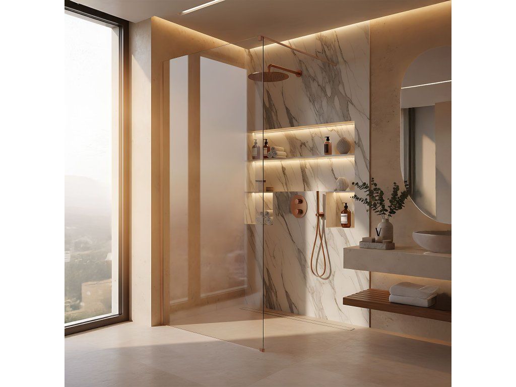 Snívate o kúpeľni plnej tepla a luxusu? Objavte sprchovú stenu walk-in Rea Flexi v zaujímavej konfigurácii: transparentné sklo a profil vo farbe kartáčovanej medi. Toto spojenie modernej formy a elegantného vyhotovenia dodáva interiéru jedinečný charakter. Konštrukcia z bezpečného 8 mm tvrdeného skla zaručuje dlhú životnosť a stabilitu.8 mm tvrdené sklo – hrubé, bezpečné transparentné sklo, ktoré vizuálne nenarúša priestor.Hliníkový profil v kartáčovanej medi – luxusná kartáčovaná povrchová úprava profilu a stabilizačného ramena, dokonale ladiaca s čírym sklom.Povrchová úprava Easy Clean – neviditeľná hydrofóbna vrstva uľahčujúca stekanie vody a chrániaca pred usadeninami mydla a vodného kameňa.Stabilizačné rameno 120 cm s možnosťou skrátenia – horné rameno v medenom odtieni je možné prispôsobiť individuálnym požiadavkám.Univerzálna montáž – stenu možno namontovať na pravú alebo ľavú stranu, na vaničku alebo priamo na podlahu.Konštrukcia Walk-In – moderný otvorený vstup bez pohyblivých prvkov, ktorý zaručuje pohodlie a spoľahlivosť.Sprchová stena Rea Flexi je ideálnou voľbou pre tých, ktorí hľadajú vycibrený štýl. Vďaka povrchovej úprave Easy Clean a kvalitným materiálom spája produkt vysokú estetiku s každodennou funkčnosťou.Dodatočné parametre