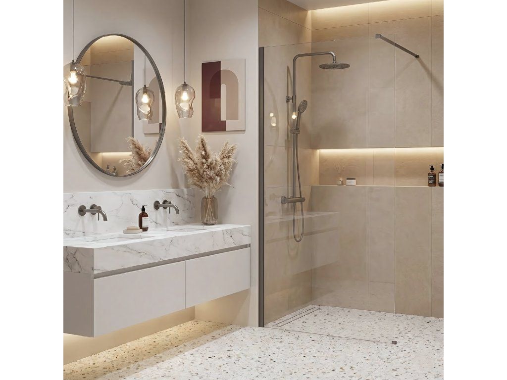 Objavte nový rozmer elegancie vo svojej kúpeľni so sprchovou stenou walk-in Rea Flexi vo verzii Titanium. Tento model spája krištáľovo čistú tabuľu transparentného skla s jedinečným profilom v odtieni Kartáčovaný Titán. Je to riešenie pre tých, ktorí hľadajú moderný a zároveň jemný štýl, ktorý opticky zväčšuje priestor.8 mm kalené sklo – hrubá priehľadná tabuľa zabezpečuje maximálnu stabilitu a bezpečnosť a zvýrazňuje priestor sprchového kúta.Hliníkový profil v kartáčovanom titáne – jedinečná titánová povrchová úprava ako moderná alternatíva ku klasickému chrómu.Povrch Easy Clean – hydrofóbna ochranná vrstva uľahčuje stekanie vody a bráni tvorbe vodného kameňa.Podporné rameno 120 cm s možnosťou skrátenia – pevné stabilizačné rameno v odtieni profilu, ktoré možno upraviť podľa potreby.Univerzálna montáž – montáž vpravo aj vľavo, na vaničku alebo priamo na podlahu s lineárnym žľabom.Walk-In konštrukcia – minimalistický dizajn bez pohyblivých prvkov, ktorý zaručuje pohodlie a dlhú životnosť.Sprchová stena Rea Flexi predstavuje dokonalú rovnováhu medzi funkčnosťou a moderným štýlom. Titánové vyhotovenie v kombinácii s transparentným sklom vytvára svetlý a priestranný sprchový priestor. Vďaka kvalitným materiálom a povrchu Easy Clean ponúka estetiku aj ľahkú každodennú údržbu.Dodatočné parametre