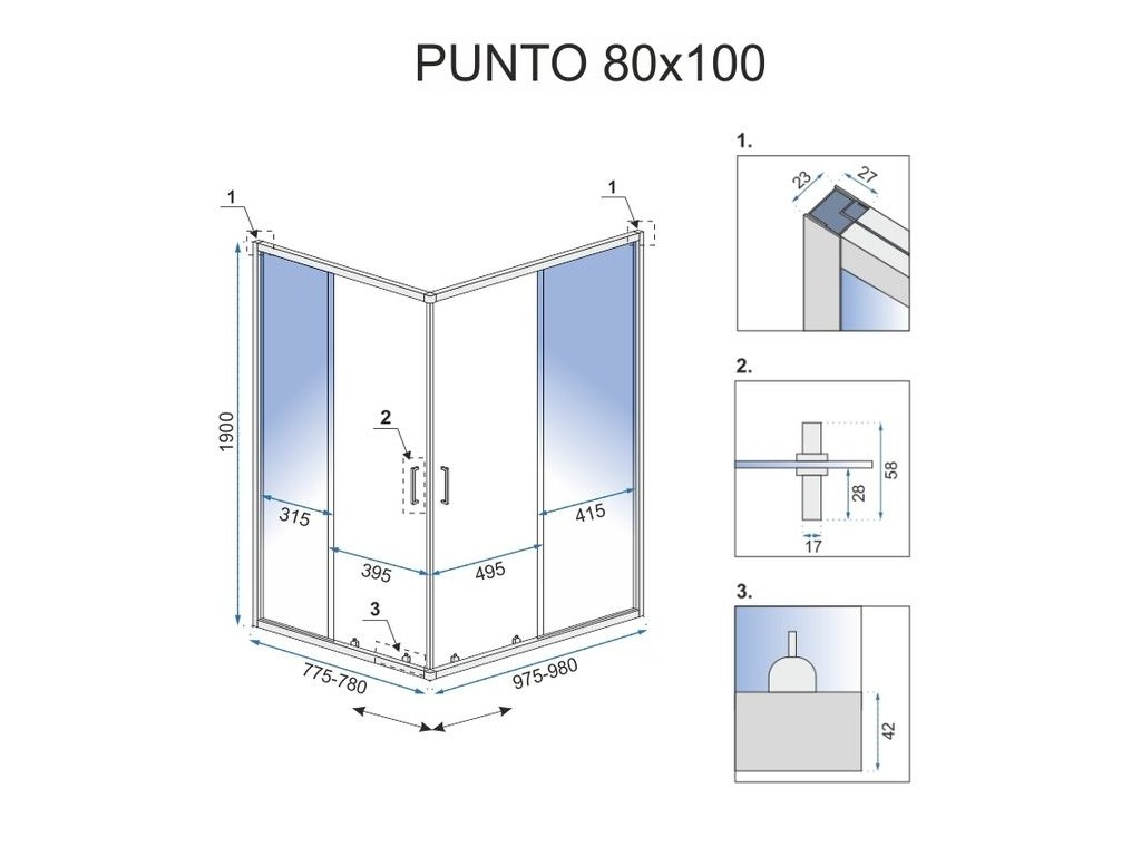 Funkčnosť a estetika sú slová, ktoré najlepšie vystihujú náš sprchový kút Punto.Tento kút určite veľmi dobre zapadne medzi ostatné dizajnové prvky kúpeľne. Pozývame vás, aby ste si pozreli aj ďalšie ponuky v našom obchode! Hrúbka skla: pohyblivé sklo 5 mm, pevné sklo 4 mmPrevedenieDodatočné parametre