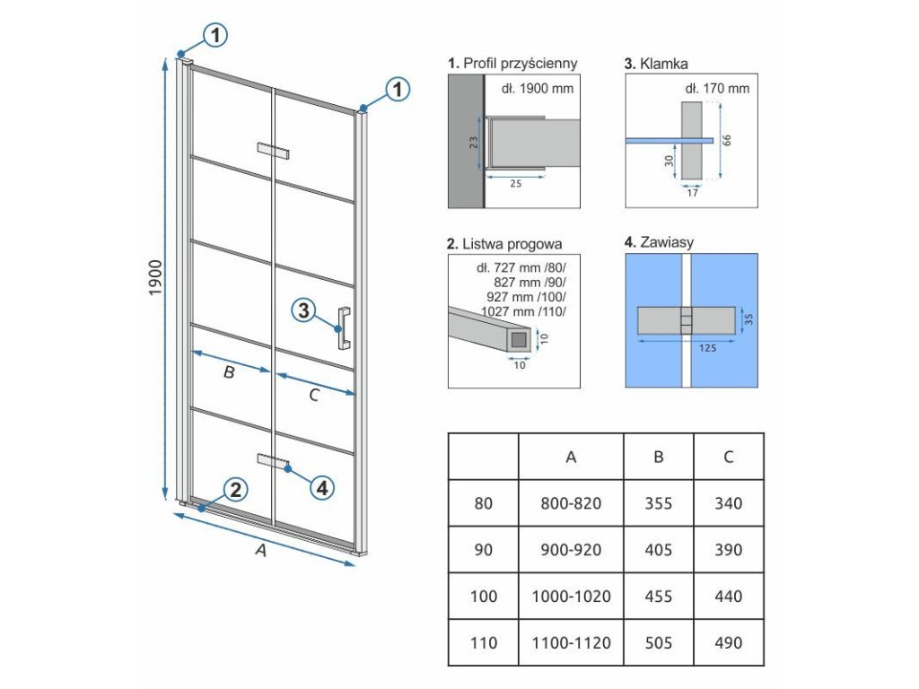 Predstavujeme vám exkluzívny model sprchových dverí z vysokokvalitného tvrdeného bezpečnostného skla Crystal Clear s laserom nanesenou povrchovou úpravou Easy Clean. Povrchová úprava je nanesená na oboch stranách dverí, takže dvere možno inštalovať na pravú aj ľavú stranu. Profil si určíte sami pred inštaláciou. Pri navrhovaní tohto modelu sme použili jednoduché formy a tvary, aby sme vytvorili dvere s pohodlným a širokým vstupom do sprchy. Vďaka jedinečnej bezrámovej konštrukcii a možnosti sklopiť dvere k stene sú dvere Molier priestorovo úsporným a ideálnym riešením pre každú kúpeľňu. Vďaka mimoriadne premysleným riešeniam zabezpečujú tesnenia použité vo dverách 100 % tesnosť a spoľahlivosť počas používania. Model Molier je ideálny nielen pre moderné kúpeľne zamerané na minimalizmus, ale aj pre klasické a vkusné interiéry. Čierna farba sa nanáša počas výrobného procesu a následne sa spolu s krídlom dvakrát temperuje pri teplote 600-800 °C. To zaručuje 100 % trvanlivosť a odolnosť voči poškriabaniu a mechanickému poškodeniu. Je to jediná metóda, ktorá zaručuje najvyššiu kvalitu a trvanlivosť. Dvere sú vhodné na inštaláciu na podlahu s lineárnym odtokom, ako aj na sprchovú vaničku. Návod na použitieDodatočné parametre