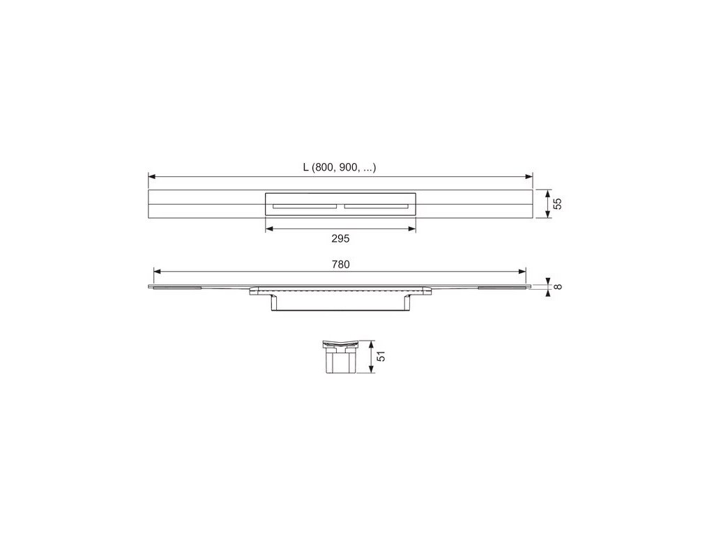 Vlastnosti produktu\n- šírka 55 mm\n- dĺžka 1000 mm\n- výška 51 mm\n- kartáčovaný povrch\n- sprchový profil z nerezovej ocele na odvodnenie sprchy, na inštaláciu do lepidla na dlažbu, nad stierku a hydroizoláciu\n- podľa potreby možno dĺžkovo skrátiť => 500 mm\n- s vnútorným spádom na zlepšenie odvodnenia a samočistiaceho efektu\n- kryt odpadu s funkciou Push po manuálnej vybratí\n- prvky pre pripojenie odpadu\n- úchyty pre jednoduchú inštaláciu a pevné spojenie pomocou lepidla na dlažbu\n- pre podlahy 8-25 mm vrátane vrstvy lepidla\n- na inštaláciu v rovine so stenou s obkladmi s hrúbkou od 10 mm vrátane vrstvy lepidla\n- pre inštaláciu pri stene (v rovine so stenou) alebo v ľubovoľnej vzdialenosti od steny\n- sifón nie je súčasťou balenia a musí sa objednať samostatne
