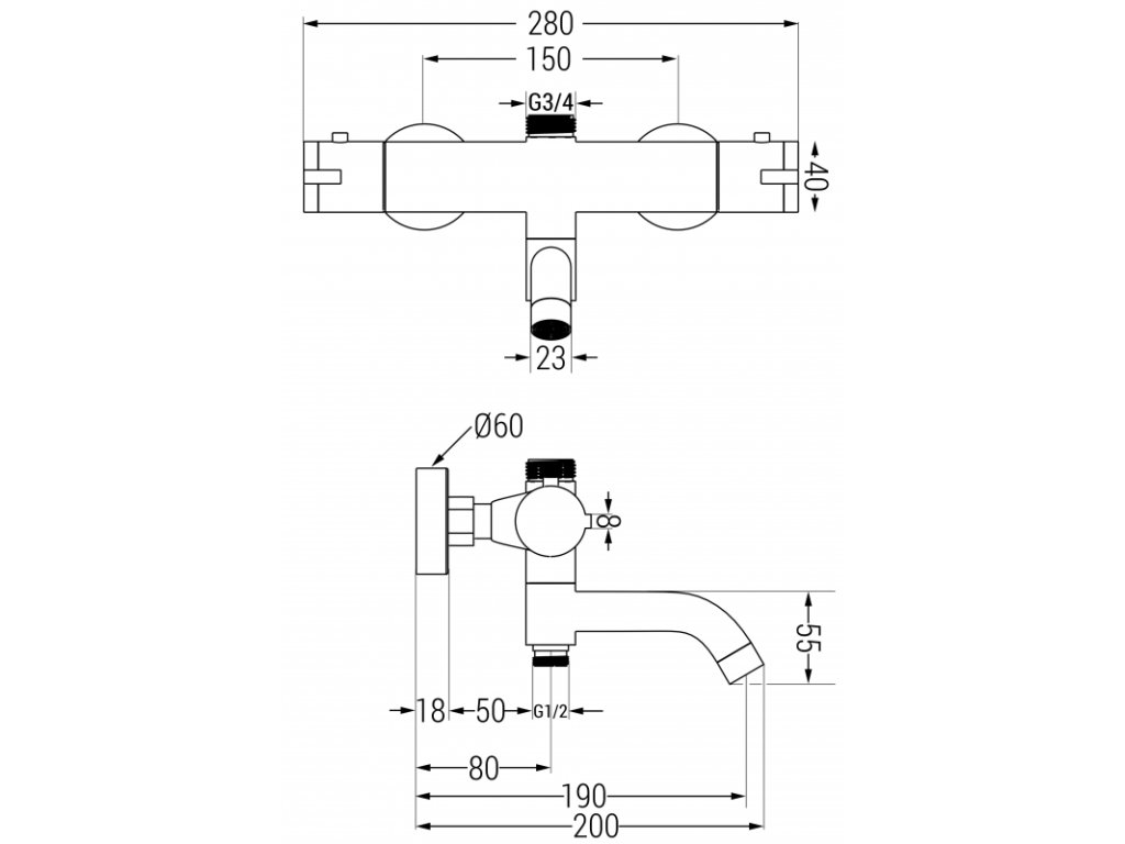 \nPripojenie sprchy: G 3/4" (hore) a G 1/2" (dole)