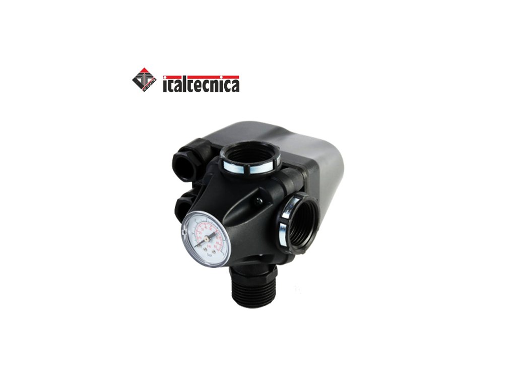 Tlakový spínač ITALTECNICA PM/5-3W 2-3,5 bar 230 V, integrovaný priamo v tvarovke, spolu s manometrom, \nJednoduchým pripojením na výtlak čerpadla, alebo na potrubie, umožňuje reguláciu jednofázových čerpadiel v závislosti na zmene tlaku v systéme.\n\nNastavenie od výroby na tlak zap/vyp: 2/3,5bar\nMožnosť nastavenia rozsahu tlakov zap/vyp: 1/5barDodatočné parametre