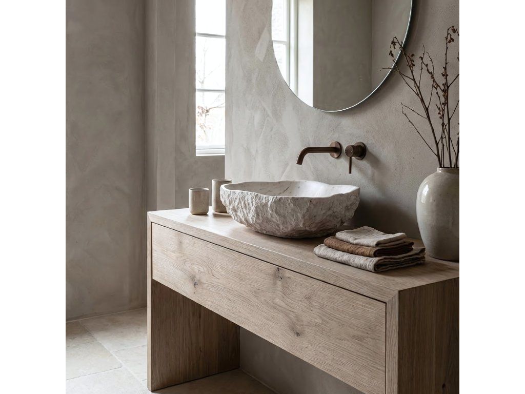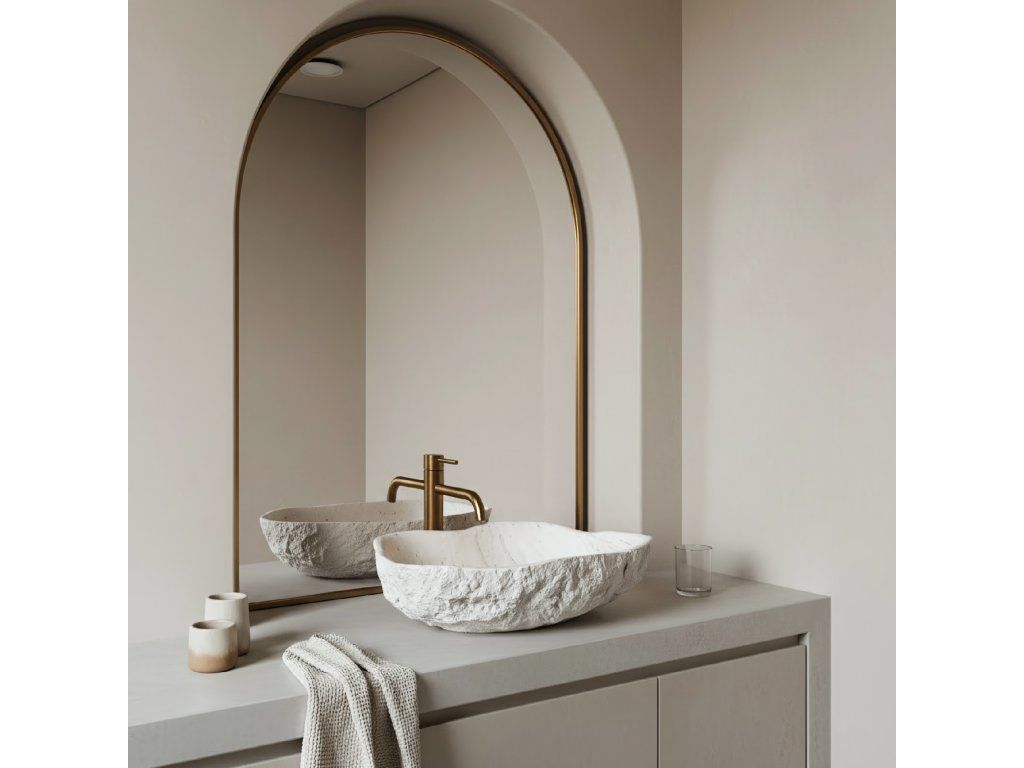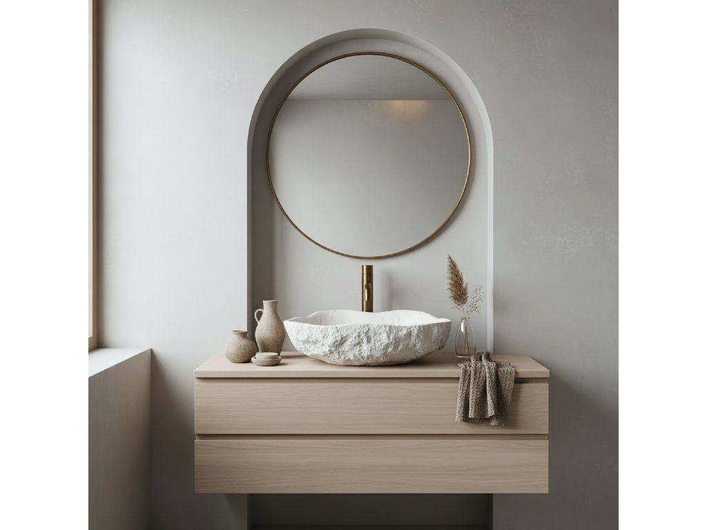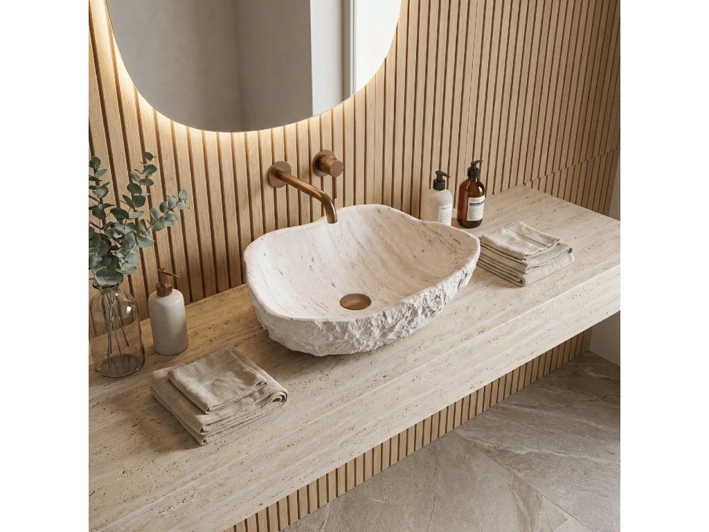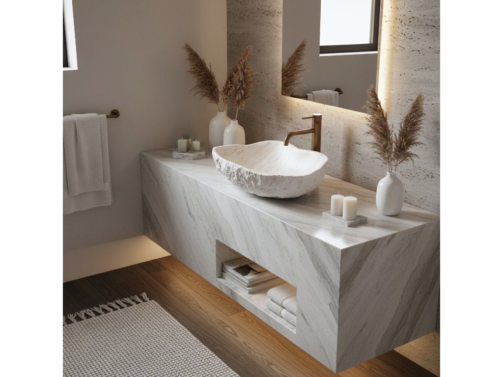 Vytvorte si v kúpeľni zónu relaxu s umývadlom na dosku Rea Isla Shiro. Tento výnimočný model upúta pozornosť nepravidelnou, organickou formou a povrchovou úpravou imitujúcou svetlý kameň. Vyrobené z kompozitného umelého kameňa Artificial Stone, spája surovú estetiku s modernou odolnosťou.Štruktúra kameňa – vonkajší povrch misy má výraznú, drsnú textúru pripomínajúcu tesanú skalu, čo jej dodáva autentický, remeselný charakter.Materiál Artificial Stone – použitý kompozit je mimoriadne pevný a odolný voči mechanickému poškodeniu, zároveň je príjemnejší a teplejší na dotyk než prírodný kameň.Prirodzená farebnosť – svetlý odtieň s jemným vzorom imituje štruktúru usadenej horniny alebo pieskovca a vnáša do interiéru pokoj a harmóniuHladký vnútorný povrch – na rozdiel od surovej vonkajšej textúry je vnútro umývadla dokonale vyleštené, čo zabezpečuje jednoduché čistenie a plynulý odtok vody.Montáž na dosku – umývadlo je prispôsobené na umiestnenie na dosku alebo skrinku, vďaka čomu je jeho sochárska forma naplno vystavená.Umývadlo Rea Isla Shiro je skvelou voľbou do kúpeľní v štýle boho, spa aj modernom. Spojenie organického tvaru s odolnosťou kompozitu z neho robí efektný a zároveň praktický prvok vybavenia, ktorý narúša geometrickú strohosť interiéru.Dodatočné parametre