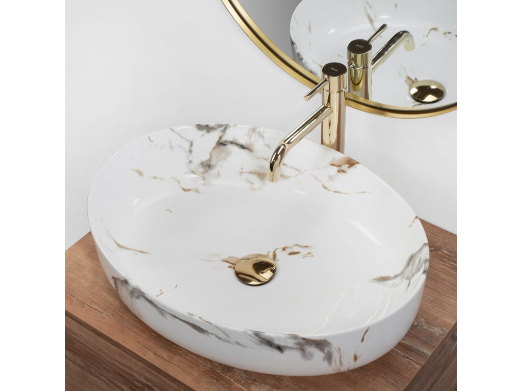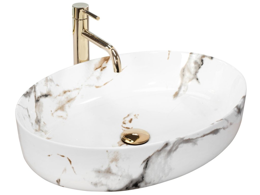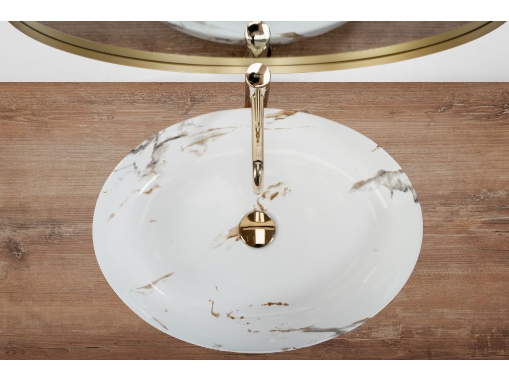 Predstavujeme Vám nové moderné umývadlo na dosku série Rea Queen. Umývadlo oválneho tvaru je vyrobené z materiálov najvyššej kvality a jeho vlastnosti splnia všetky vaše požiadavky. Tento model ocení predovšetkým zákazník, hľadajúci nielen funkčné, ale aj estetické riešenie. Umývadlo je určené na montáž na dosku, ale je možné ho kombinovať aj so skrinkou. Umývadlo v bielom lesklom prevedení s mramorovým efektom sa navyše vďaka špeciálnej fáze výroby ľahko čistí, je veľmi odolné a má svoj jedinečný vzor.Dodatočné parametre