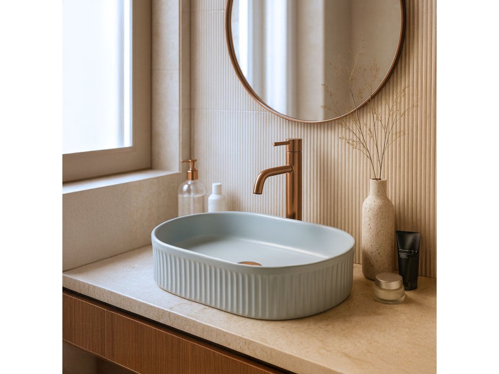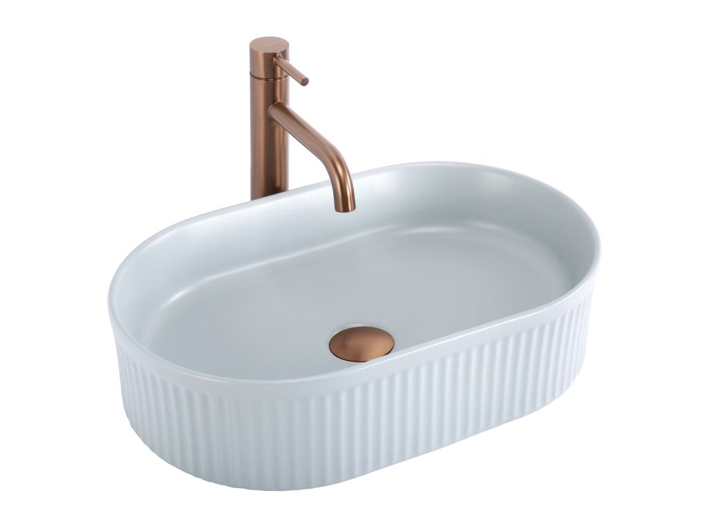 Umyvadlo na dosku v odtieni Baby Blue Matt je moderný prvok, ktorý dodá kúpeľni sviežosť a výnimočný štýl. Matný povrch v jemnom pastelovom modrom odtieni pôsobí decentne a zároveň púta pozornosť svojím originálnym vzhľadom. Vyrobené z kvalitnej sanitárnej keramiky, umyvadlo zaručuje trvácnosť a jednoduchú údržbu. Jeho ryhovaný vonkajší povrch predstavuje efektnú ozdobu, ktorá spája funkčnosť s originálnym dizajnom a dokonale zapadá do moderných interiérov.Dodatočné parametre