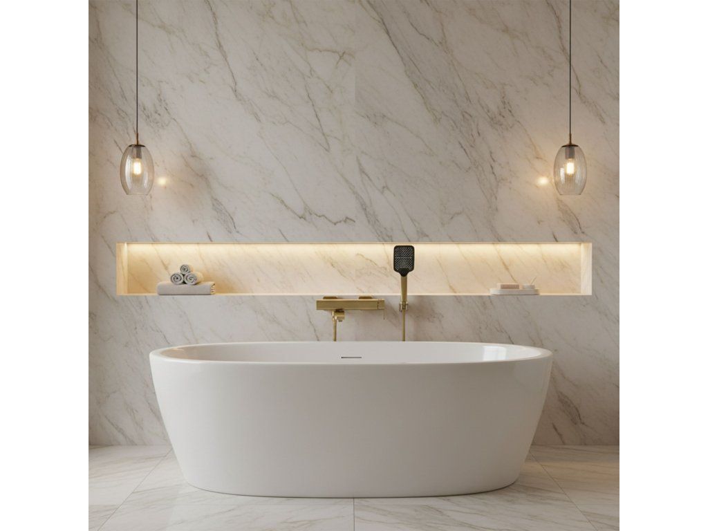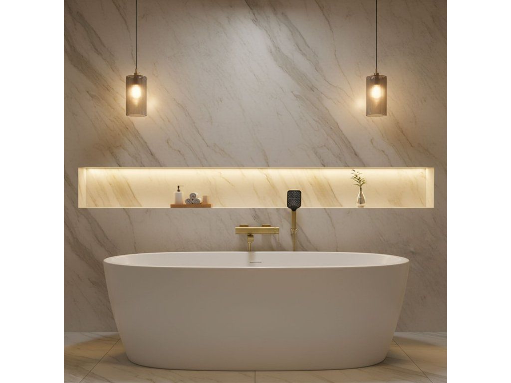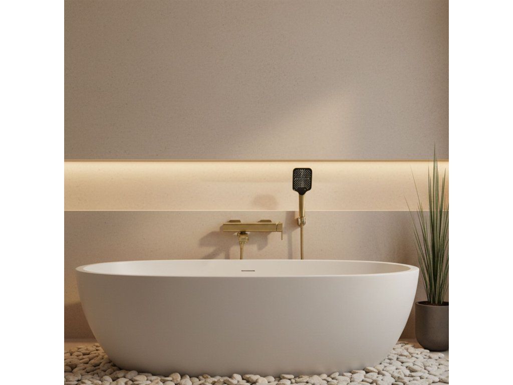 Vytvorte si v kúpeľni relaxačnú zónu s jedinečným štýlom – zvoľte nástennú vaňovú batériu Rea Arlo vo vyhotovení brúsené zlato. Tento model je esenciou moderného dizajnu: geometrické telo a ploché povrchy dokonale ladia s umývadlovou armatúrou z rovnakej série. Kompletný sprchový set zabezpečuje funkčnosť aj vizuálnu jednotu interiéru.Moderný dizajn – pre sériu Arlo typická plochá výtoková hubica a čisté línie tela dodávajú batérii minimalistický a elegantný vzhľad.Farba brúsené zlato – ušľachtilá matná povrchová úprava, ktorá je efektná aj praktická, pretože pomáha maskovať odtlačky prstov.Kompletný sprchový set – súčasťou je batéria, hadica a štýlová obdĺžniková ručná sprcha s nástenným držiakom, všetko ako zladený celok.Ručná sprcha so systémom Anti-Calc – moderná sprcha so silikónovými dýzami, ktoré bránia usádzaniu vodného kameňa a uľahčujú čistenie.Keramická kartuša – „srdce“ batérie, ktoré zabezpečuje plynulú a presnú reguláciu prúdu aj teploty po dlhý čas.Perlátor – integrovaná koncovka výtoku prevzdušňuje vodu, vďaka čomu je prúd mäkší a úspornejší.Vaňová batéria Rea Arlo v zlatej farbe je skvelou voľbou pre tých, ktorí chcú spojiť estetiku s komfortom používania. Jej geometrická forma a teplý zlatý odtieň vytvárajú výrazný akcent v kúpeľni a perfektne ladia s modernými obkladmi a keramikou. Pevné spracovanie a dôraz na detaily zaručujú spokojnosť pri každom kúpeli.Dodatočné parametre