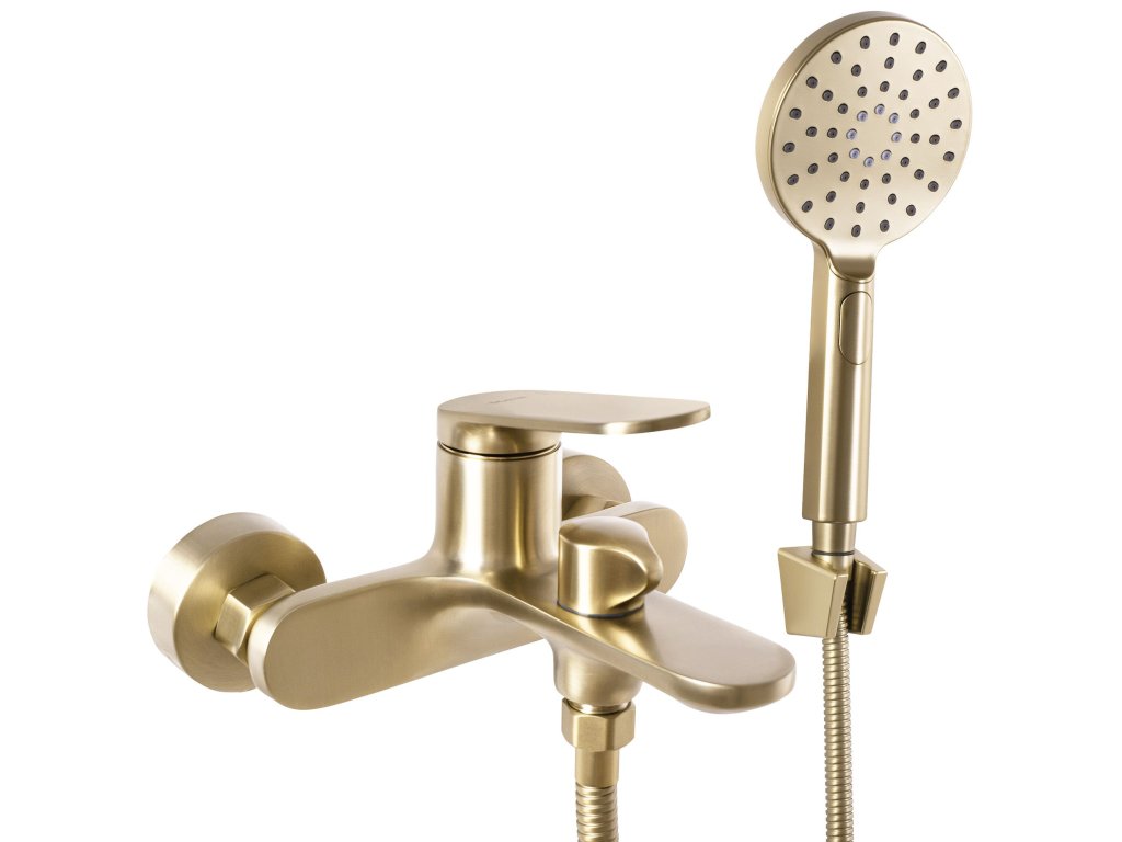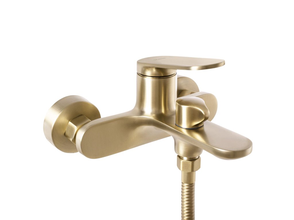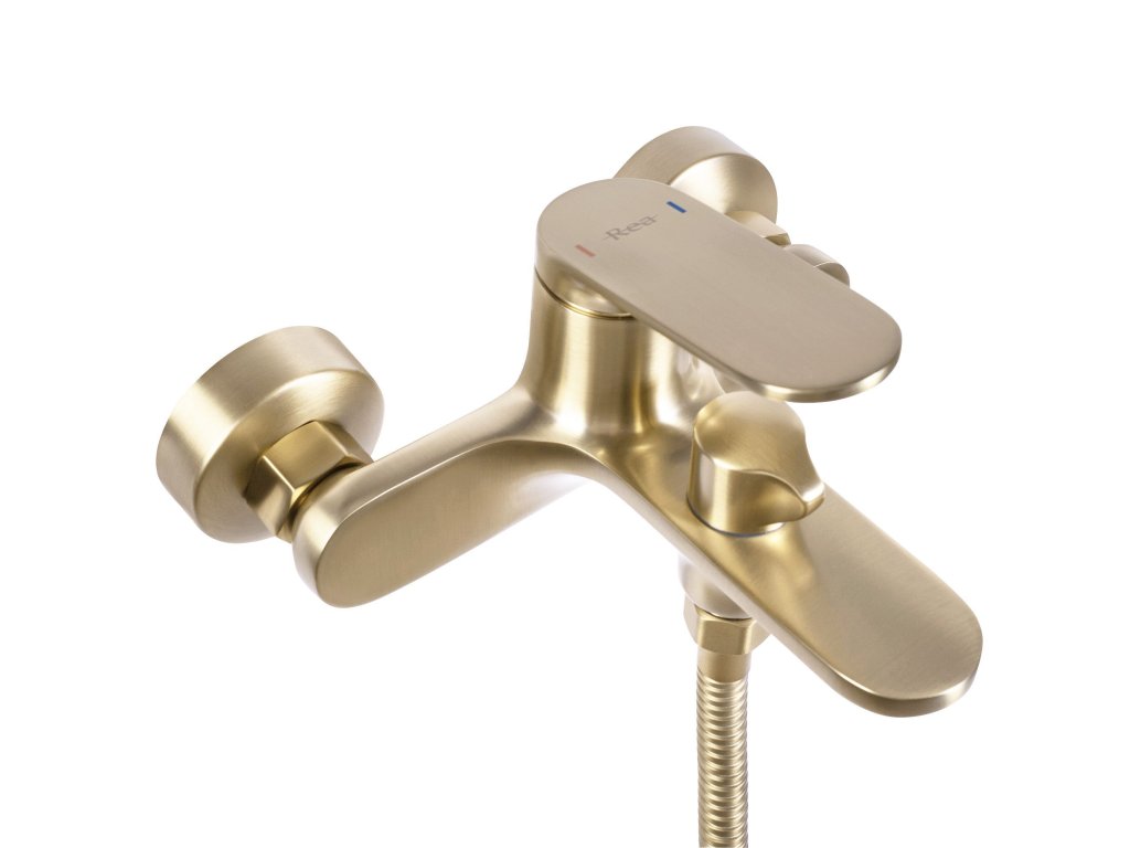 Dovoľte nám predstaviť modernú, neobyčajne funkčnú a štýlovú vaňovú batériu. Táto batéria sa bude perfektne hodiť do Vašej kúpeľne, v ktorej súčasne zachová bezúhonný vzhľad aj estetiku interiéru. Batéria je určená na montáž na stenu a jej korpus je vyrobený z kvalitnej mosadze, pokrytej trojitým povlakom, a špeciálna fáza, ktorá bola použitá pri výrobe tejto batérie, zaisťuje ľahké čistenie a vysokú odolnosť.\n\nTento konkrétny model vaňovej batérie z obľúbenej série Rea Viral bol zhotovený v šľachetnom prevedení brúseného zlata.\n\nMontážny návodDodatočné parametre