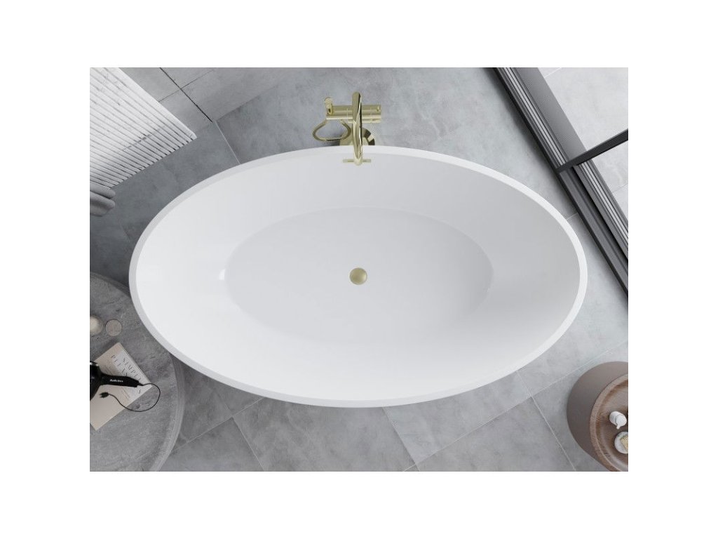 Voľne stojaca vaňa Mexen Nike je kombináciou štýlu a funkčnosti. Rozmery 175 x 100 cm a hĺbka 45 cm zaručujú pohodlie, zatiaľ čo oválny tvar dodáva eleganciu. Je vyrobená zo sanitárneho akrylátu a je odolná voči dechtovaniu a UV žiareniu, čo zaručuje jej dlhú životnosť. Zlatý kartáčovaný povrch a kontrastné bielo-čierne farby vytvárajú moderný dizajn. Vaňa má prepadový otvor a dodáva sa so sifónom a zacvakávacou zátkou na jednoduchú inštaláciu.Dodatočné parametre