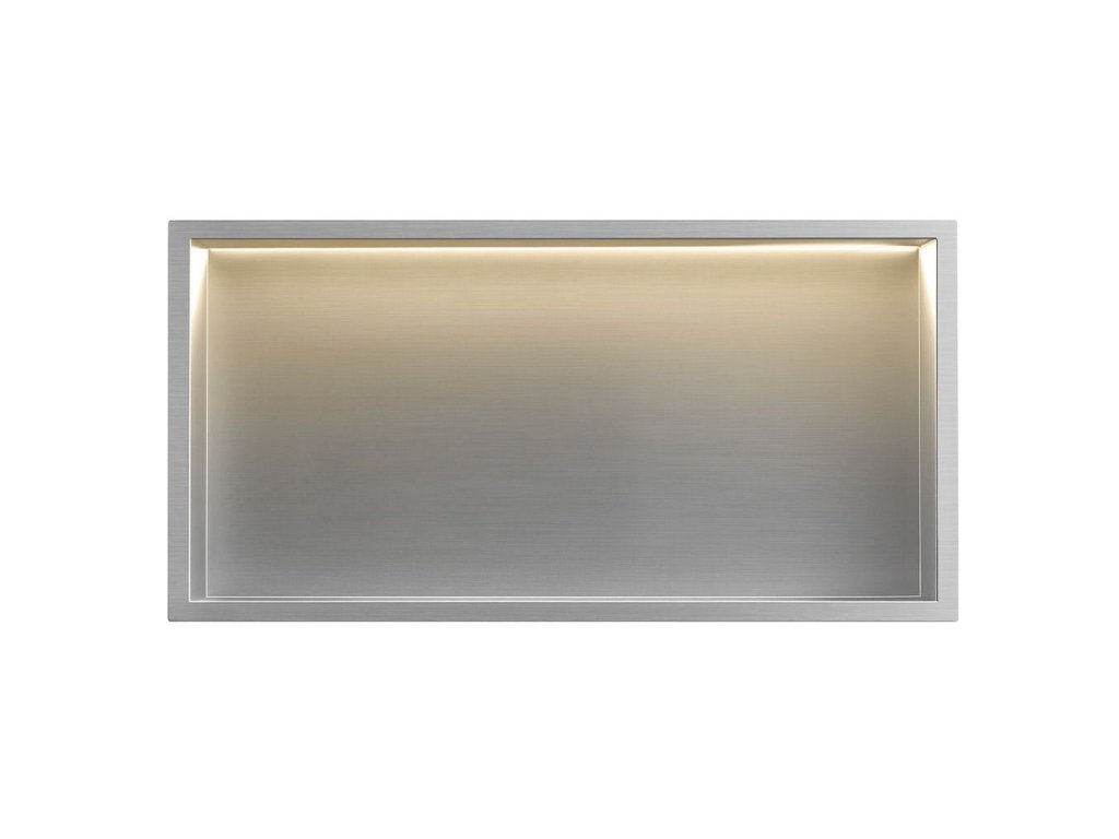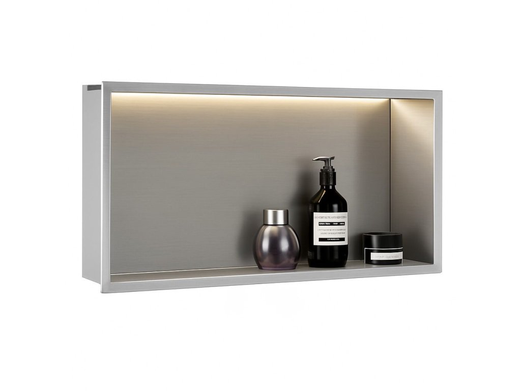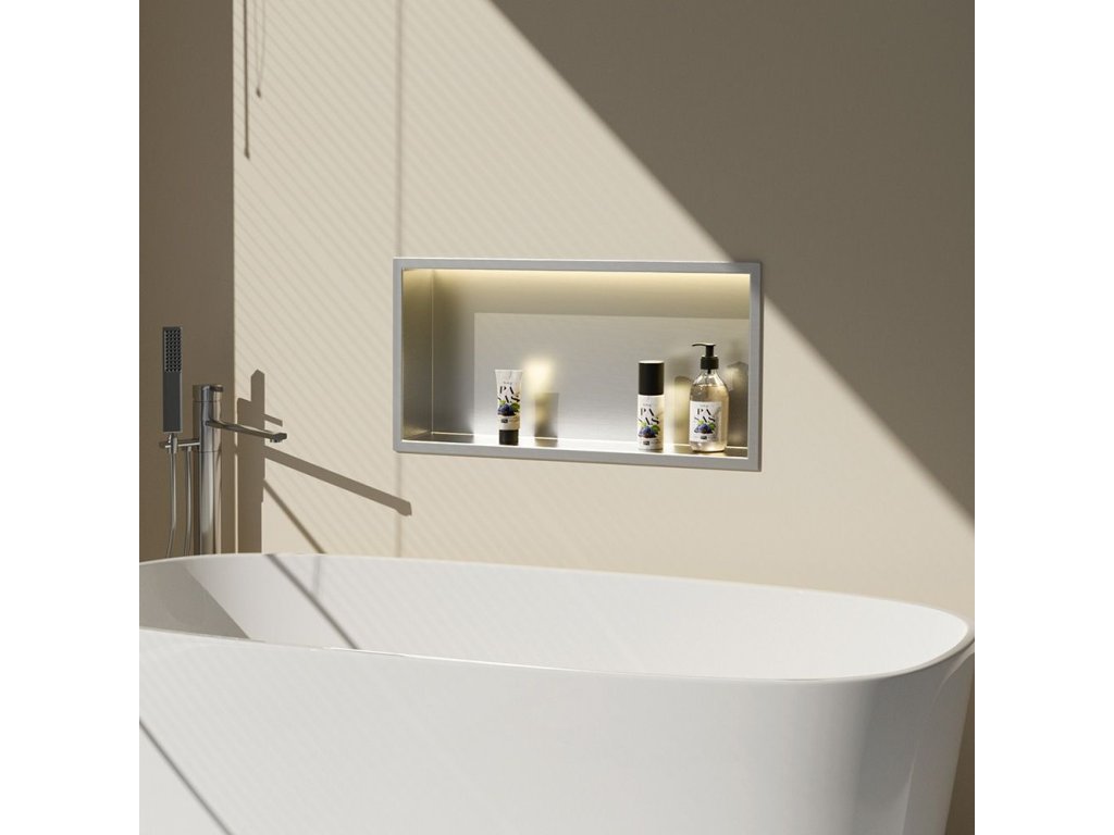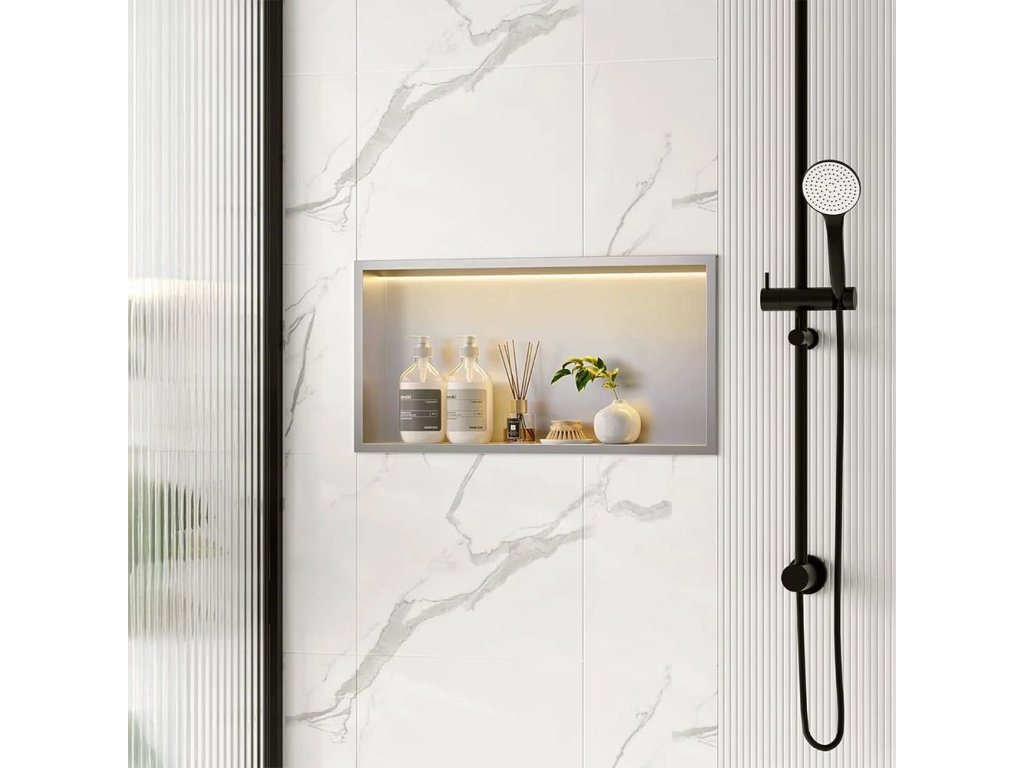 Nástenná kúpeľňová polica s LED osvetlením je funkčné a estetické riešenie, ktoré sa skvele hodí do sprchy, nad vaňu alebo do inej časti kúpeľne. Vyrobená z vysoko kvalitnej nehrdzavejúcej ocele Aisi 304, je odolná voči vlhkosti, korózii a intenzívnemu používaniu, takže si zachováva svoj vzhľad po mnoho rokov. Integrovaný Led pás s výkonom 12 W a farbou svetla 3000K vyžaruje teplé, príjemné svetlo, ktoré dodáva interiéru atmosféru a zároveň zvyšuje pohodlie každodenného používania. Montáž do niky vytvára minimalistický a moderný efekt a polica poskytuje praktické miesto na uloženie kozmetiky a kúpeľňových doplnkov. Je to praktický prvok vybavenia kúpeľne, ktorý spája moderný dizajn, odolnosť a dodatočné osvetlenie, ktoré podčiarkuje eleganciu interiéru.Dodatočné parametre