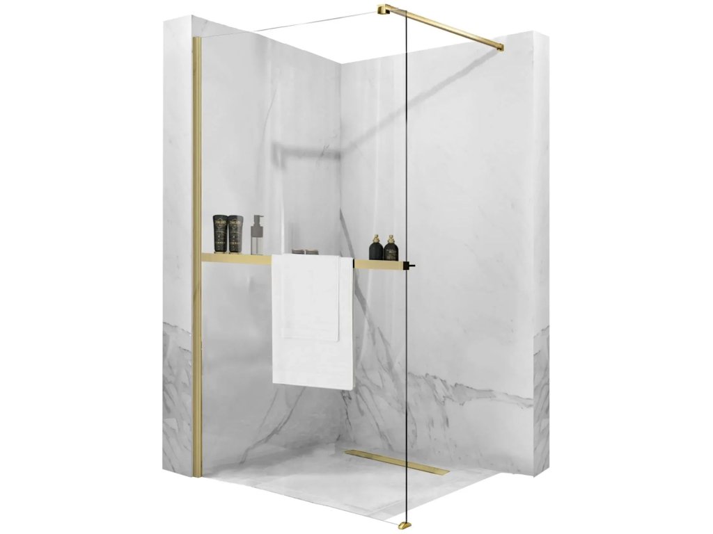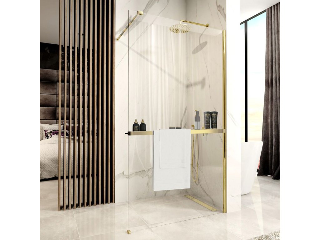 Úplne perfektný a praktický držiak na uteráky s poličkou pre všetky sprchové zásteny.\n\nDržiak s poličkou je možné použiť pre všetky sprchové zásteny s maximálnou hrúbkou skla 8mm a dĺžkou do 1200mm.\n\nFarebné prevedenie zlatá.\n\nMontážny návodDodatočné parametre