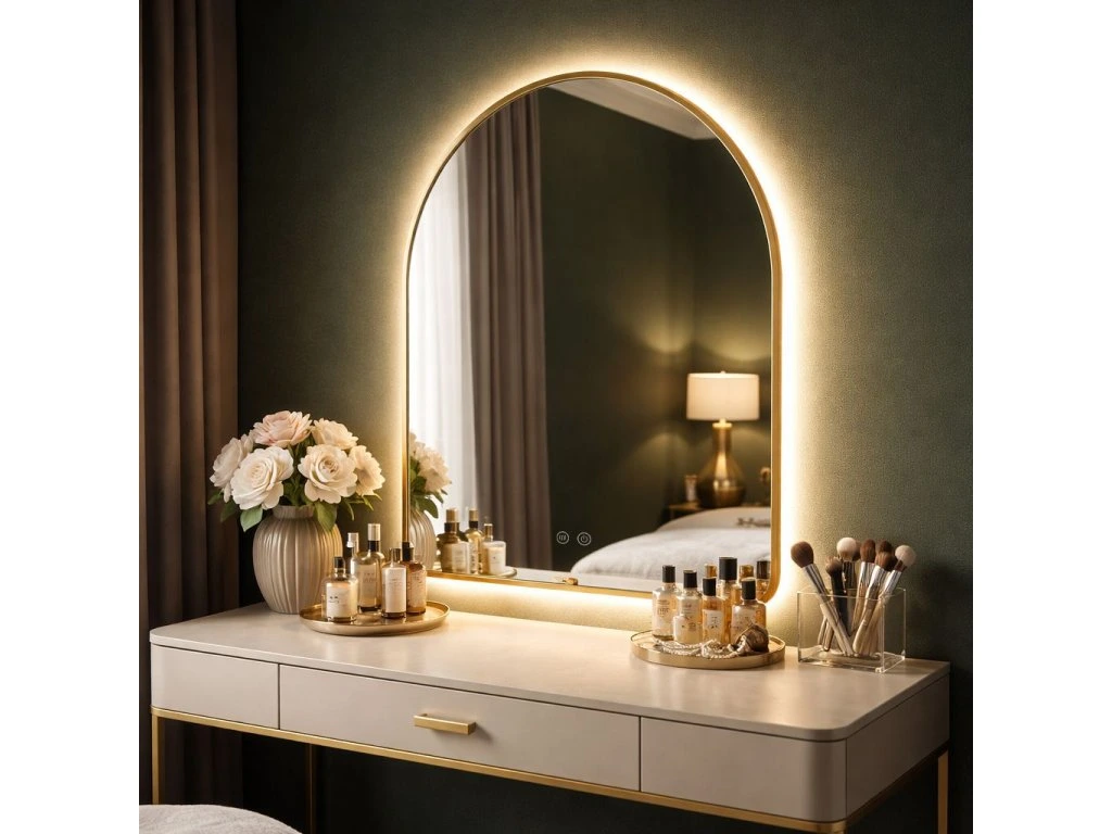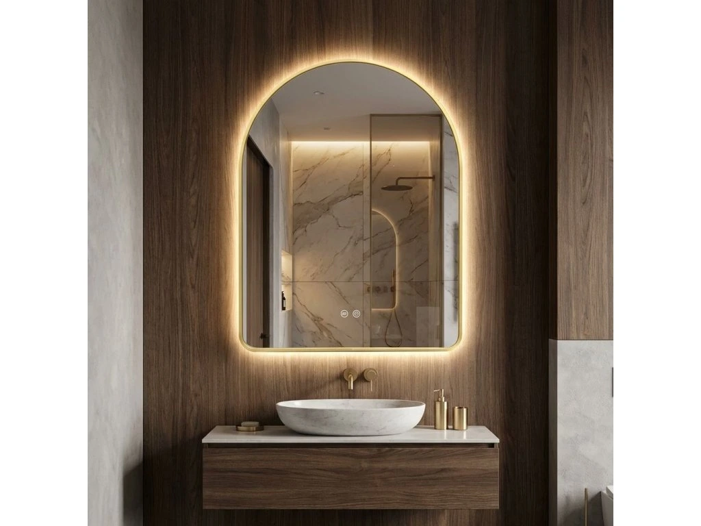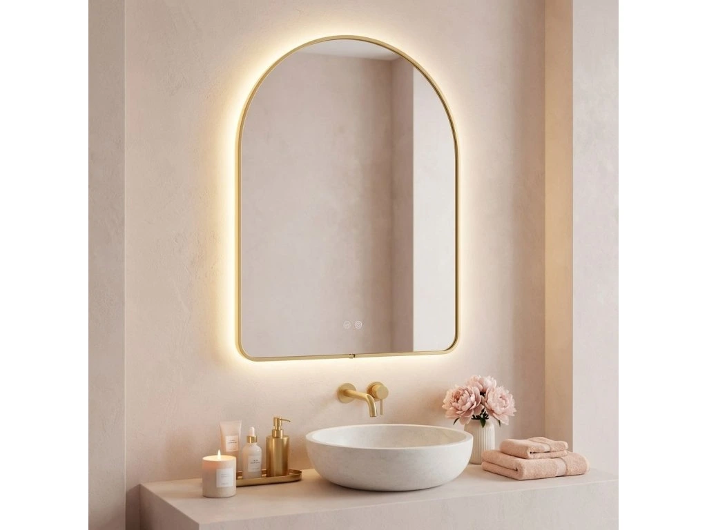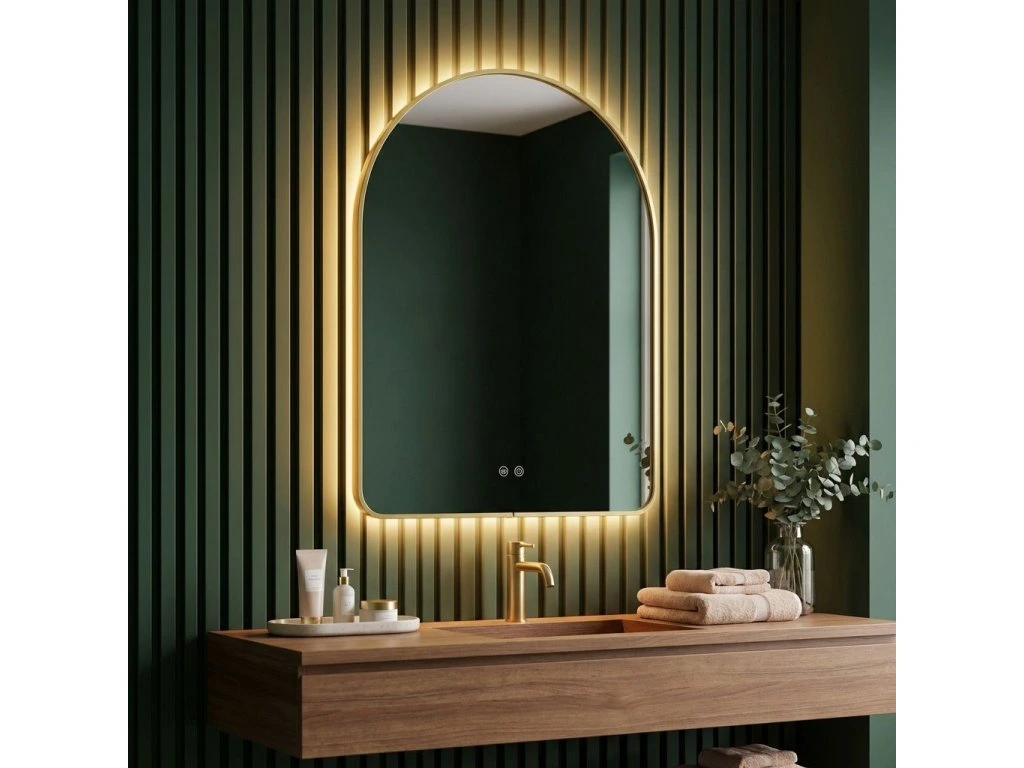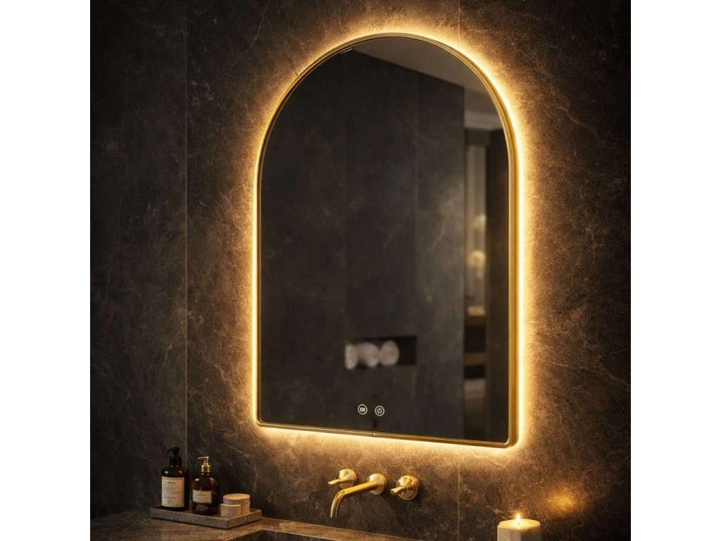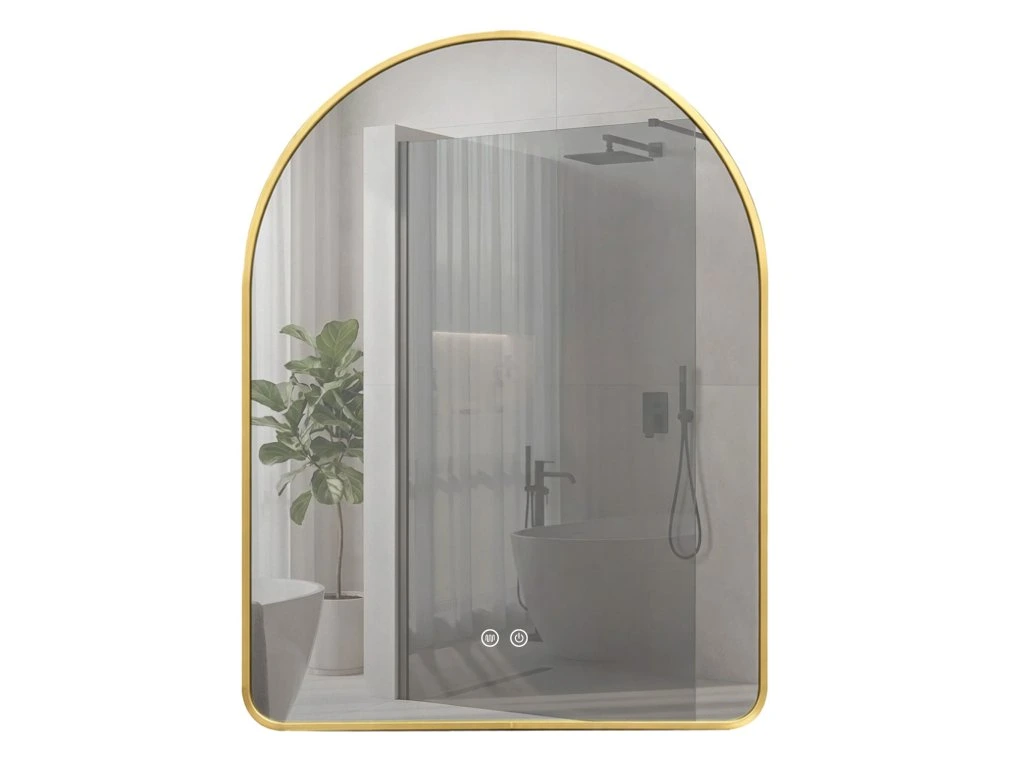 Kúpeľňové LED zrkadlo Camlot s rozmermi 80×60 cm je elegantným spojením klasického tvaru oblúka s modernou technológiou osvetlenia. Výrazný zlatý rám s kartáčovanou povrchovou úpravou dodáva interiéru luxusný charakter a robí zo zrkadla ústredný dekoratívny bod každej štýlovej kúpeľne.Jemný tvar oblúka (Arch) – zaoblená horná hrana zrkadla vnáša do interiéru mäkkosť a harmóniu a narúša rovné línie tradičného kúpeľňového nábytku.Rám vo farbe kartáčovaného zlata – robustné puzdro s estetickým spojom v spodnej časti skla podčiarkuje prestížny vzhľad výrobku. Kartáčovaná štruktúra je matná a elegantná a dokonale maskuje drobné stopy používania.Teplá farba svetla s funkciou stmievania – integrované LED podsvietenie vyžaruje príjemné teplé svetlo, ktoré vytvára útulnú atmosféru. Intuitívny systém umožňuje plynulú reguláciu jasu a prispôsobenie intenzity žiary vašim potrebám.Systém Anti-Fog (Vykurovacia rohož) – funkcia vyhrievania skla účinne zabraňuje jeho zahmlievaniu a zaisťuje jasný odraz aj bezprostredne po horúcom kúpeli alebo sprche.Dotykové ovládanie – dve podsvietené tlačidlá umiestnené v spodnej časti zrkadla umožňujú pohodlné ovládanie osvetlenia a funkcie proti zahmlievaniu jediným dotykom.Pripravené na zapojenie – zrkadlo je vybavené káblom so zástrčkou, čo umožňuje rýchlu inštaláciu a zapojenie do štandardnej elektrickej zásuvky bez nutnosti úpravy elektroinštalácie.Výberom LED zrkadla Camlot 80×60 cm v zlatom ráme stavíte na špičkovú estetiku a každodennú funkčnosť. Je to ideálna voľba do kúpeľní v modernom štýle, glamour a art déco, kde záleží na každom detaile a vysokej kvalite spracovania.Dodatočné parametre